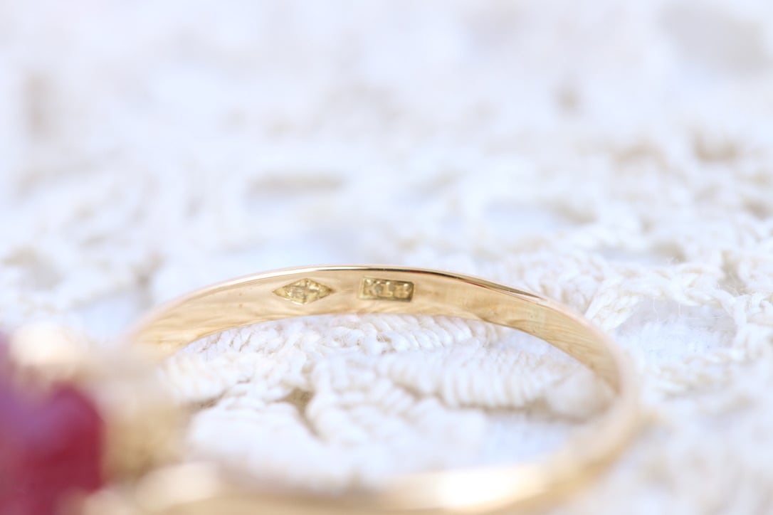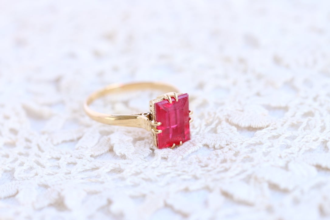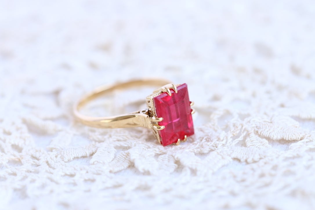 小さめのスクエアにカットされた合成ルビーの18金リング。